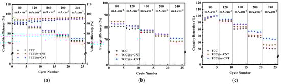The TCC, TCC@s-CNT and TCC@n-CNT were used as cathode electrodes; the TCC was employed as the anode electrode to assemble single cells, and the efficiencies (coulombic efficiency, CE; voltage efficiency, VE; energy efficiency, EE) and capacity retention (CR) rate of the single-cells under various current densities were obtained, as shown in Figure 4. In Figure 4a, the CE values of each single cell rises with the increase in current density, while the VE value demonstrates an opposite trend. The CE value of the VRFB assembled with the TCC@s-CNT is the largest, and the CE values of the TCC and TCC@n-CNT are relatively close. At a current density of 80 mA/cm2, the CE value of the VRFB containing the TCC@s-CNT is 93.67%, which is about 3.3% higher than that of the TCC and TCC@n-CNT. Nevertheless, as the current density increases, the CE values of the VRFB assembled with the TCC and TCC@n-CNT remain comparable, while the disparity in CE values between the TCC@s-CNT and the other two samples progressively diminishes. At a current density of 240 mA/cm2, the CE value of the VRFB containing the TCC@s-CNT is 95.93%, which is only about 1% higher than that of the TCC and TCC@n-CNT. The reason for this phenomenon should be related to the crossover or permeation of V4+/V5+ in the membrane [,]. In the environment of the Nafion membrane, the size of hydrophilic ion channels (3~5 nm) is much larger than the hydration diameter of vanadium ions (about 0.6 nm), and V4+/V5+ is highly prone to penetrate from the cathode to the anode, resulting in phenomena such as vanadium ion valence imbalance and water migration [,]. At low current densities, VRFBs assembled with the TCC@n-CNT exhibit a lower CE value than that of those with the TCC@s-CNT. The reason may be that short CNTs (TCC@s-CNTs) may increase the CE value through a shorter charge-transfer distance []. However, the network structure of the TCC@n-CNT cannot function at low current densities (<120 mA/cm2). Under ahigh current density (>160 mA/cm2), the improvement in fluid dynamics conditions (such as the turbulence promotion effect) may partially offset this negative impact, reducing the difference in CE values between the two. Similar strategies have been successfully applied in other systems (e.g., lithium–sulfur batteries), such as the use of CNT/C3N4 composite structures to suppress polysulfide shuttles. The mechanism is comparable to that of blocking vanadium ion penetration [].
