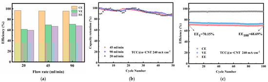 To further optimize the relationship between the network structure of the TCC@n-CNT and the flow field, Figure 5 demonstrates the performance of the battery assembled with the TCC@n-CNT at 240 mA/cm2 under different electrolyte flow rates. In Figure 5a, from the CE value perspective, the lower the flow rate, the greater the CE value obtained by the VRFB, that is, in descending order of CE 20 mL/min (CE = 96.85%) > 45 mL/min (CE = 96.03%) > 90 mL/min (CE = 95.73%). It can be seen that the network structure of the TCC@n-CNT has a hierarchical (micropore–mesopore synergistic) pore structure, which is more conducive to electrolyte penetration at low flow rates. But in terms of VE values, the higher the flow rate, the greater the VE value obtained by the VRFB, that is, in the order of VE from small to large: 20 mL/min (VE = 61.40%) < 45 mL/min (VE = 69.75%) < 90 mL/min (VE = 71.05%). Similarly, the continuous network of the TCC@n-CNT establishes a continuous penetrating electrical conduction pathway, which accelerates the load transfer at high flow rates. Hence, under the influence of the VE value, the higher the flow rate, the greater the EE value obtained by the VRFB.