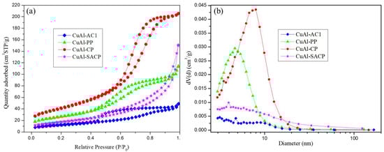 The results of N2 adsorption measurements are also shown in Table 1. The SBET (m2/g) of the calcined catalysts followed the order CuAl-CP (144) > CuAl-SACP (69) > CuAl-PP (63) > CuAl-AC1 (43). The Vp (cm3/g) values presented the same sequence order: 0.32 > 0.24 > 0.17 > 0.06. The highest pore diameter (dp, nm) was reached by CuAl-CP (8.0), followed by CuAl-PP (4.7), CuAl-SACP (3.7), and CuAl-AC1 (3.2). The N2 adsorption–desorption isotherms of the calcined are shown in Figure 1a, while Figure 1b shows the pore distribution. All the calcined CuAl catalysts exhibit a Type IV isotherm, which is associated with mesoporous materials due to hysteresis. The CuAl-PP and CuAl-CP catalysts show a pore size distribution centered at 4.7 and 8 nm, respectively, while the CuAl-SACP and CuAl-AC1 catalysts show a broader pore size distribution.