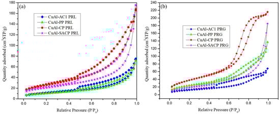 The SBET value (m2/g) of the catalysts used in the gas phase (PRG) showed the following tendency: CuAl-CP (141) > CuAl-PP (87) > CuAl-SACP (69) > CuAl-AC1 (45).