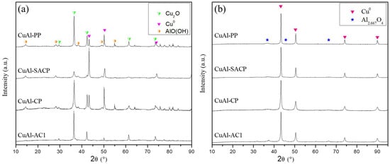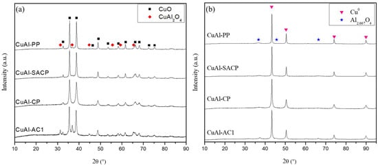 Figure 3a shows the XRD patterns of calcined CuAl catalysts synthesized by different preparation methods: CuAl-AC1, CuAl-PP, CuAl CP, and CuAl-SACP. The diffraction peaks at 32.6°, 35.6°, 38.8°, and 48.9° reveal the presence of a CuO phase (JCPDS file n°. 00-048-1548) [52], while peaks located at 31.1°, 37.0°, and 44.7° correspond to the CuAl2O4 spinel phase (JCPDS file n°. 01-078-1605) [53]. The presence of a CuO phase can be observed in all CuAl catalysts. However, the presence of the CuAl2O4 spinel phase is just elucidated in the CuAl-AC1 and CuAl-PP catalysts. The CuAl materials obtained through preparation methods which include a gelation–combustion step, CuAl-AC1 and CuAl-PP, have shown spinel-type phases (CuAl2O4) which implies a higher level of metal–support interaction, as can be seen in previous reports [47].
