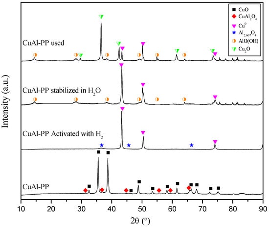 In order to study the possible electronic transfer from Cu0 to the substrate in the liquid phase, as proposed above, the CuAl-PP catalyst was analyzed by XRD after being subjected to an aqueous medium without glycerol. Figure 5 shows the XRD patterns after four stages: calcination, activation with H2, aqueous medium at 227 °C and 34 bar, and use in glycerol conversion. It is clearly observed that the hydrothermal conditions strongly promote boehmite formation and the Cu0 phase is almost unaffected. On the other hand, the used CuAl-PP catalyst clearly shows oxidation from Cu0 to Cu2O. The Cu0 phase strongly decreases while Cu2O phases sharply appear. These results are in concordance with those of other authors [27]. They suggested the electron transference from Cu0 to chemisorbed acetol during glycerol hydrogenolysis. In this way, Cu may act as an electron transfer agent for acetol hydrogenation to 1,2-PDO in the liquid phase. In the gas phase (Figure 4b), this phenomenon cannot be elucidated, i.e., Cu0 is not oxidized to Cu2O during the reaction, as previous works established [24]. This fact can suggest the role of pressure in promoting the electron transference phenomenon.