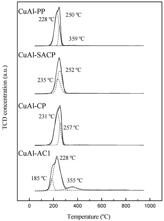 The CuAl catalysts that exhibit spinel phases in XRD analysis (Figure 3a), such as CuAl-PP and CuAl-AC1, show additional reduction peaks that correspond to the reduction of the CuAl2O4 spinel phase between 326–359 °C, as previously reported [66]. The ratio of the different phases is displayed in Table 3.