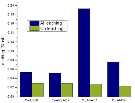 Mass percentage of Cu and Al leaching of the used catalysts in liquid phase. Liquid-phase reaction conditions: 227 °C, 34 bar, 10 wt% glycerol, and 10 g cat min/g gly.