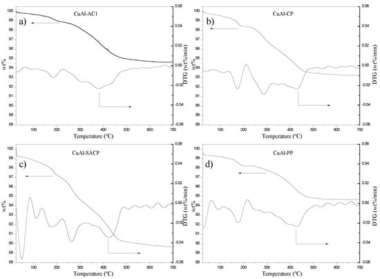 Figure 10 shows the TGA results obtained from the CuAl catalyst used in the liquid phase. Step I, between 25–140 °C, is associated with the loss of physisorbed water, while Step II, between 140–700 °C, is associated with the dehydration of boehmite to Al2O3. Thus, a greater weight loss is due to a greater formation of boehmite during the reaction conditions. The % weight loss in Step II follows the following trend: CuA-SACP (8.78%) > CuAl-CP (6.07%) > CuAl-AC1 (4.89%) > CuAl-PP (4.36%). These results indicate that CuAl catalysts obtained by precipitation methods (CP and SACP) tend to form larger amounts of boehmite under the selected reaction conditions.