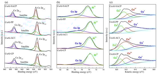 XPS was used to assess the composition and oxidation state of Cu on the surface of the catalysts used in liquid-phase reactions. XPS data from Cu 2p, Al 2p, and Cu LMM are presented in Figure 11a, b and c, respectively.