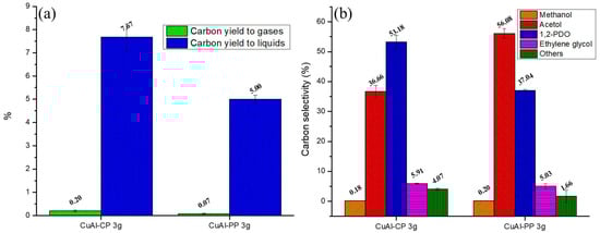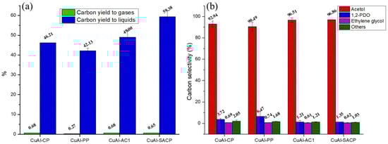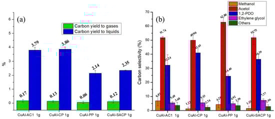 Figure 12a,b shows the experimental results using the CuAl catalysts in the liquid phase with a W/m ratio of 10 gcatalyst·min·gglycerol−1 (g cat min gly−1). The carbon yield to liquids was higher than the carbon yield to gases for all catalysts. The carbon yields to products were very low, with the carbon yield to liquids being less than 4%. The CuAl-AC1 and CuAl-CP catalysts showed carbon yield to liquids values around 3.9%. The carbon yield to liquids obtained with the CuAl-SACP catalysts was around 2.4%, while that generated with CuAl-PP was 2.1%, the lowest value (Figure 12a). The carbon yield to gases was around 0.14% for the CuAl-AC1, CuAl-CP, and CuAl-SACP catalysts, while the CuAl-PP catalyst showed the lowest carbon yield to gases at 0.06%.