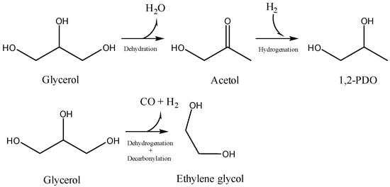 The production of acetol and/or 1,2-PDO involves dehydration and dehydration–hydrogenation, conducted in either the gas (at atmospheric pressure) or liquid (at high pressure) phase. While most studies have focused on gas-phase glycerol dehydration/hydrogenolysis [17,18,19,20,21], the liquid-phase process requires less energy due to the absence of water vaporization and operates at moderate pressures (~34 bar) and low temperatures (227 °C) [13].