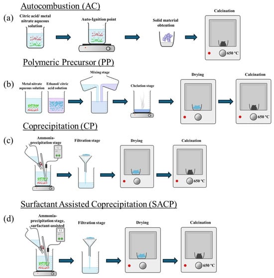 Polymeric precursor (PP) and auto-combustion (AC) preparation methods involve a combustion step that strongly affects metal dispersion and intermetallic interaction. PP is a widely studied method [34,35,44,45,46] that involves the chelation of metallic cations by citric acid in a water solution. Then, the remaining carboxylic acid function is polyesterified with ethylene glycol. This chelation step allows obtaining a homogeneous resin that promotes metal interaction. Moreover, the increment of temperature during the chelation step also favors metallic interactions.