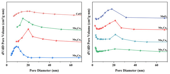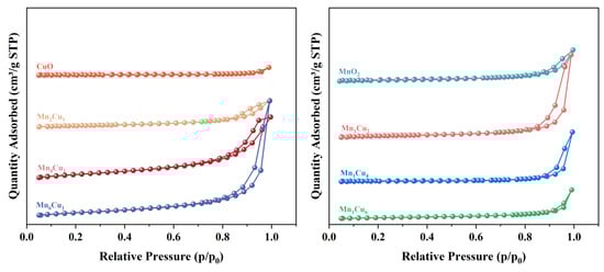 - All synthesized catalysts possessed a well-defined mesoporous structure, with pore diameters distributed between 2 and 50 nm. It should be noted that the Mn4Cu1 catalyst exhibited the highest specific surface area of 45.54 m2/g, significantly surpassing the other catalysts.