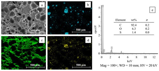 Characterization of 5 wt.% Amberlyst-15/ABS catalytic filaments: (a) surface morphology, (b) sulfur distribution, (c) carbon distribution, (d) oxygen distribution, and (e) EDS spectra.