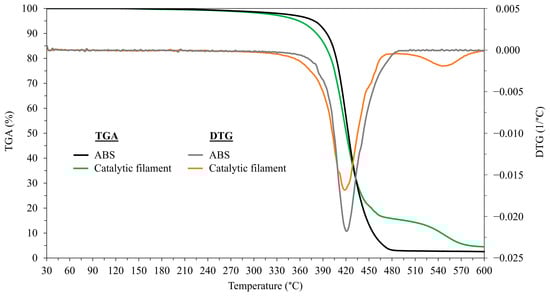 Thermogravimetric (TGA) and derivative thermogravimetric (DTG) analysis profiles of ABS and Amberlyst-15/ABS catalytic filaments.