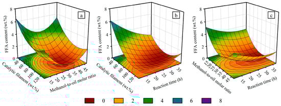 Three-dimensional response surface and contour plots illustrating the influence of three variables on the FFA content in ECPO: (a) methanol-to-oil molar ratio and catalytic filament loading, (b) reaction time and catalytic filament loading, and (c) reaction time and methanol-to-oil molar ratio.