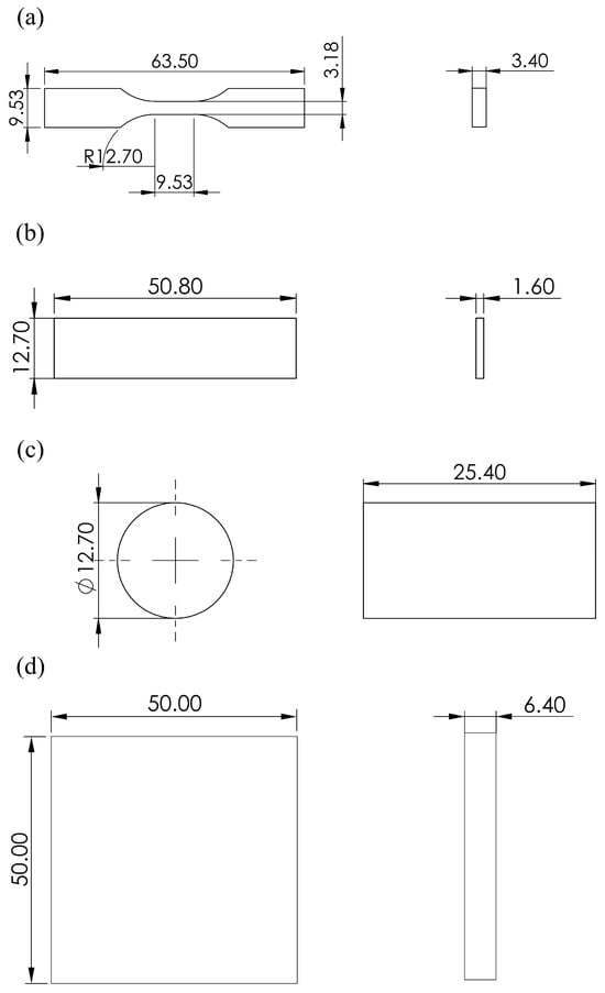 Drawings and dimensions (in millimeters) of the 3D-printed specimens used for (a) tensile testing, (b) compressive testing, (c) flexural testing, and (d) hardness testing.