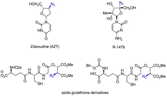 Azides are widely used in organic chemistry as precursors to amines, potential sources of nitro compounds, dipoles in 1,3-diapolar cycloadditions, and starting materials for iminophosphines. The azido group exhibits widespread reactivity in many chemical transformations and is a powerful tool for synthesizing nitrogen-containing heterocycles [1,2,3,4,5]. Chiral azides are a special subclass of chiral amines that are widely present in biologically active compounds (Figure 1). For example, azido nucleosides have been used to treat AIDS, R-1479 is a hepatitis C inhibitor, azido glutathione derivatives are potent inhibitors of the aldehyde oxidase enzyme in Staphylococcus aureus, and the compound also has the potential to induce apoptosis in Malleya holdei, Turbella florida, and Mycobacterium tuberculosis. Chiral azides play an important structural role in the synthesis of various derivatives of chiral products, and the catalytic asymmetric synthesis of chiral azides is a growing research topic that is increasingly being recognized [6,7,8,9,10,11].