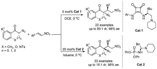- Ding, P.G.; Zhou, F.; Wang, X.; Yu, J.S.; Zhou, J. H-bond donor-directed switching of diastereoselectivity in the Michael addition of α-azido ketones to nitroolefins. Chem. Sci. 2020, 11, 3852–3861. [Google Scholar] [CrossRef]