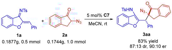 To illustrate the synthetic practicality of this asymmetric Michael addition reaction, an amplification of template reaction for tenfold was performed. Azadiene 1a (0.1875 g, 0.5 mmol), azidoindanone 2a (0.1744 g, 1.0 mmol), and 5 mol% C7 in 5 mL acetonitrile solvent was stirred at room temperature for 18 h (Scheme 3); the reaction provided 3aa in 83% yield with 87:13 dr and 90:10 er. It can be observed that after tenfold amplification, except for a slight decrease in diastereoselectivity, both enantioselectivity and yield can effectively maintain the small-scale effect of the template reaction.