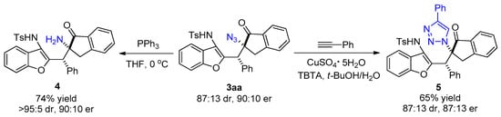 To further explore the practicability of this asymmetric reaction, a derivatization reaction was performed on compound 3aa (Scheme 4). Compound 3aa was dissolved in anhydrous THF, and triphenylphosphine was added under vigorous stirring at 0 °C. The reduction product 4 was obtained in 74% yield with >95:5 dr and 90:10 er. In addition, the compound 3aa, phenylacetylene, and tert-butyl 2,2,2-trichloroacetimidate (TBTA) were dissolved in t-BuOH, and sodium ascorbate dissolved in water and copper sulfate pentahydrate were added under vigorous stirring. The reaction succeeded in obtaining the triazole-containing benzofuran derivative 5 in 65% yield with 87:13 dr and 87:13 er. These derivatization reactions demonstrate the application value of this strategy in the synthesis of bioactive molecules.