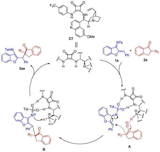 We have tried to culture the single crystal of products 3 or derivatives 4 and 5, but all trials failed to obtain enantiopure single crystals for x-ray diffraction analysis. Based on the similar reaction substrates with our previous report on the Michael addition reaction of α-thiocyanoindanones with azadienes [14], the relative configurations were assigned for products 3 based on a similar reaction pathway. We proposed a plausible reaction mechanism for this squaramide-catalyzed asymmetric Michael addition (Scheme 5). α-Azidoindanone 2a is enolized and deprotonated by quinidine of chiral quadramide C7. At the same time, benzofuran-derived azadiene 1a is activated by catalyst C7 through hydrogen bonding. This dual activation pattern of chiral quadramide C7 on two substrates (transition state A) leads to stereoselective Michael addition to give the intermediate B. The intermediate B then undergoes intramolecular protonation to complete the Michael addition to give the product 3aa.
