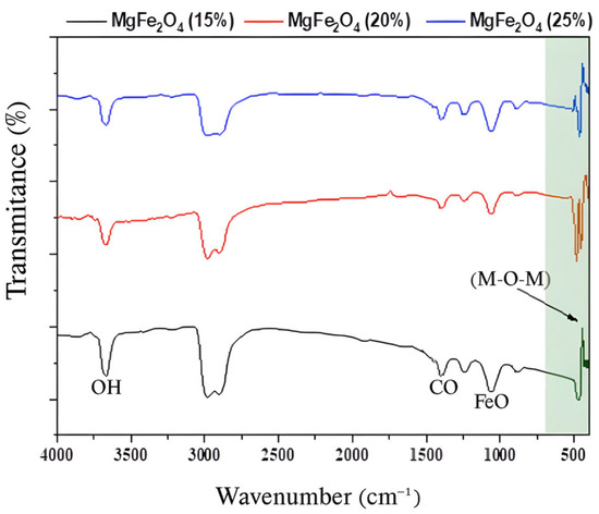 Using synthesized nanoparticles, the powder and both supported and non-supported tissue were analyzed using infrared spectroscopy by measuring the transmittance (%) as a function of frequency (cm−1) at room temperature. Fourier transformation equipment of the JASCO FT/IR-4200® type was used in the spectral range of 400–4000 cm−1. The FTIR spectra of MgFe2O4 powders with varying percentages in Mg ranging from 15% to 25% are displayed in Figure 2. The metal–oxygen–metal (M-O-M) links (where M = Fe, Mg) vibrated, resulting in the observed 420 and 510 cm⁻1 absorption bands. This confirms that the metal oxide was created. Furthermore, Fe-O stretching modes were responsible for the peaks at 1072 and 1253 cm−1. Moreover, the C-H vibrational modes were responsible for the peaks observed at 1442 and 1250 cm−1 [58]. Generally, the carbon–hydrogen vibrational bond is a result of the absorption of 2900–3000 cm−1, and the recorded peak at 3625 cm−1 is attributed to the (O-H), isolated OH in Mg(OH)2 [59].