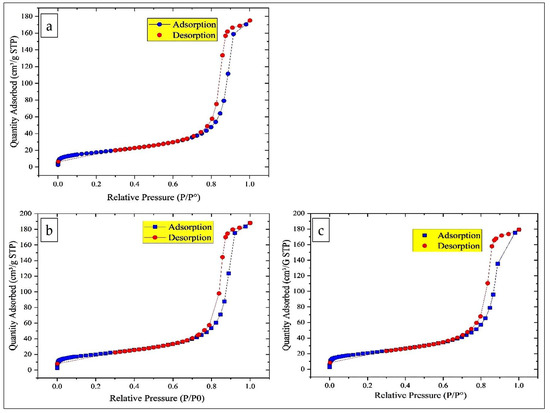 The nitrogen adsorption–desorption isotherms for all the catalysts are of type IV according to the IUPAC classification, indicating the presence of mesoporous materials. Moreover, the H1 type hysteresis observed is typical of cylindrical pores formed by the agglomeration of spherical particles of similar size arranged in a uniform packing pattern (Figure 4). The increase in specific surface area of MgFe2O4 (15% MgFe2O4-Sarea = 62.74 ± 0.1235 m2/g; 20% MgFe2O4-Sarea = 71.17 ± 0.1118 m2/g; 25% MgFe2O4-Sarea = 73.92 ± 0.1129 m2/g) with increasing Mg content can be attributed to several factors. As Mg ions may replace Fe in the Fe2O3 lattice, the crystal structure is perturbed, leading to the formation of surface defects and vacancies that expose more surface area. This substitution can also promote the formation of smaller particles or nanostructures, increasing the surface area to volume ratio. In addition, the incorporation of Mg can increase the porosity of the material, creating more mesopores that contribute to the overall surface area.