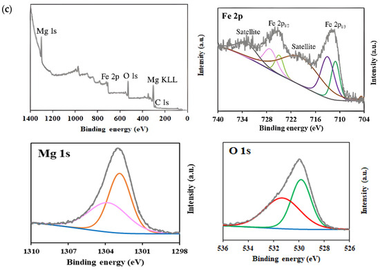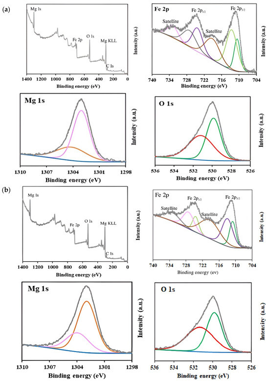 XPS analysis was carried out to determine the surface chemical composition and the oxidation states of elements in MgFe2O4 samples (Figure 5). Survey spectra confirmed the presence of Mg, Fe, and O elements in all samples. High-resolution spectra of Mg 1 s exhibited two peaks centered at ~1303.9 eV and ~1302.9 eV, which are characteristic of Mg2+ in both tetrahedral and octahedral sublattices [62,63]. With the increase in Mg content during synthesis, a slight increase in the relative intensity of the peak at ~1302.9 eV was observed, from 67.6% in the 15% MgFe2O4 sample to 71.2% in the 25% MgFe2O4 sample, suggesting a higher occupancy of octahedral sites.