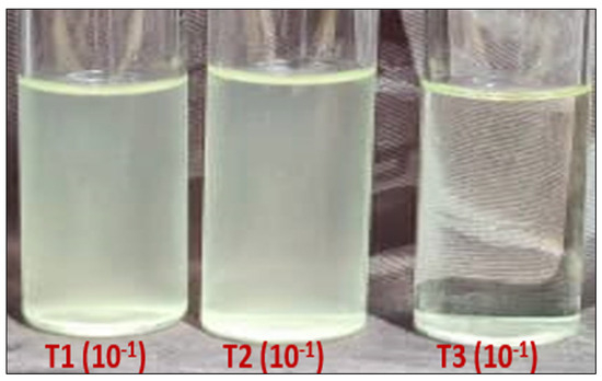 The results obtained with the 10−2 bacterial dilution confirm those of the previous one. Thus, 64 CFU were obtained with the untreated control (1 h bacteria–physiological water contact), 112 CFU with the T2 treatment (1 h bacteria–MgFe2O4 contact in absence of light), and 0 CFU were obtained with the T3 treatment (1 h bacteria–MgFe2O4 contact in the presence of light) (Table 1, Figure 7).