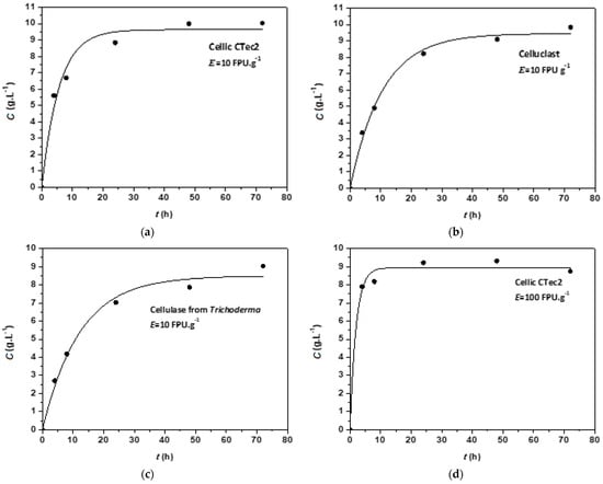 Temporal profiles of glucose concentration in the enzymatic hydrolysis of glucan: (a) Cellic CTec2 cocktail (E = 10 FPU.g−1); (b) Celluclast cocktail (E = 10 FPU.g−1); (c) Cellulase from Trichoderma cocktail (E = 10 FPU.g−1); (d) Cellic CTec2 cocktail (E = 100 FPU.g−1).