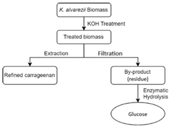 The biomass of K. alvarezii was treated with a 6% KOH solution for 24 h at room temperature. The resulting material was washed, dried, milled, and extracted with water at 65 °C for 2 h. The suspension was filtered, resulting in an insoluble residue retained on the filter, while the fraction that passed through was identified as refined carrageenan. The chemical composition of the insoluble residue was assessed following NREL procedures for biomass composition [].