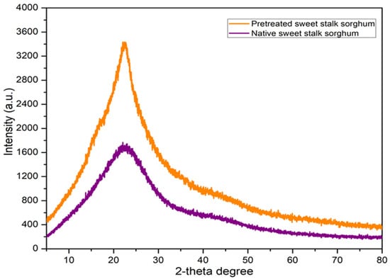 Prepared and pretreated samples of native sweet stalk sorghum were subjected to X-ray crystallinity analysis. Crystallinity indexes were analyzed using an X’Pert PRO device (Panalytical, Almelo, The Netherlands) with Cu Kα radiation (λ = 0.1540 nm). The samples were scanned from 10° to 60° at a speed of 5°/min, and crystallinity was calculated using the following equation: