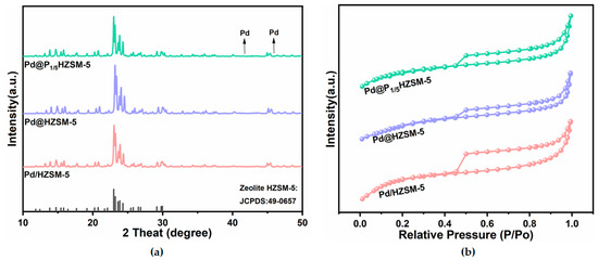 Figure 1. (a) XRD patterns of Pd@HZSM-5, Pd@P1/5HZSM-5, and Pd/HZSM-5; (b) BET patterns of Pd@HZSM-5, Pd@P1/5HZSM-5, and Pd/HZSM-5.