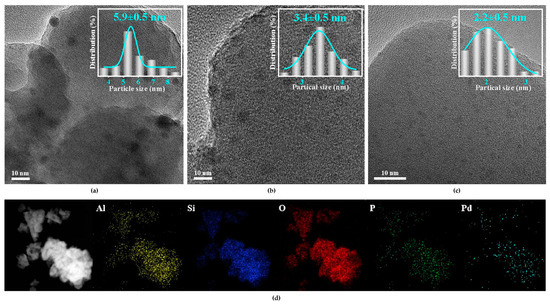 The TEM images of Pd/HZSM-5, Pd@HZSM-5, and Pd@P1/5HZSM-5 catalysts are shown in Figure 2. It is clear that Pd nanoparticles are uniformly dispersed. Particle size distributions were statistically analyzed. The average particle size of Pd/HZSM-5 was 5.9 nm, while Pd@HZSM-5 and Pd@P1/5HZSM-5 exhibited 3.4 and 2.2 nm, respectively. TEM analysis demonstrates that encapsulation significantly improves Pd dispersion, which might be caused by the confined effect of zeolite pores [41]. The Energy-Dispersive Spectroscopy (EDS) mapping of Pd@P1/5HZSM-5 showed that all elements are uniformly distributed with good dispersion and no agglomeration of the Pd NPs over Pd@HZSM-5 and Pd@P1/5HZSM-5.