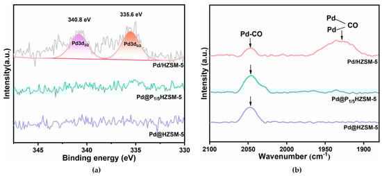 The results of the CO diffuse reflectance infrared Fourier transform spectroscopy (CO-DRIFTS) of Pd/HZSM-5, Pd@HZSM-5, and Pd@P1/5HZSM-5 are shown in Figure 3b. The adsorption peaks observed at 1930 cm−1 and 2045 cm−1 are assigned to the bridge-bonded and linearly adsorbed CO species on Pd nanoparticles, respectively [41,42]. Notably, the Pd/HZSM-5 catalyst displays a dominant bridge adsorption mode, whereas Pd@HZSM-5 and Pd@P1/5HZSM-5 exhibit preferential linear CO adsorption. The CO-DRIFTS spectra of Pd@PxHZSM-5 (Figure S3b) all showed peaks for linear CO adsorption, lacking bridge-bonded CO features. The absence of peaks for the bridge-bonded CO species might be ascribed to the encapsulation of Pd nanoparticles in Pd@HZSM-5 and Pd@PxHZSM-5 [41,43]. The encapsulation of Pd nanoparticles results in spatial confinement effects, which restricts the bridge adsorption of CO and facilitates the linear adsorption.