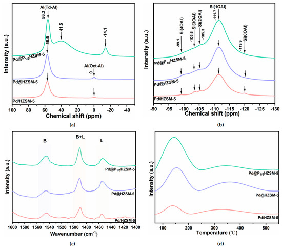 Figure 4b presents the 29Si solid-state NMR spectra of the Pd/HZSM-5, Pd@HZSM-5, and Pd@P1/5HZSM-5 catalysts. Five distinct characteristic peaks are observed at −119.9 ppm, −111.7 ppm, −105.3 ppm, −103.6 ppm, and −99.1 ppm, corresponding to the chemical environments of Si(0OAl), Si(1OAl), Si(2OAl), Si(3OAl), and Si(4OAl), respectively [18]. Notably, the Si(1OAl) signals in the Pd@HZSM-5 and Pd@P1/5HZSM-5 catalysts are significantly enhanced, while the Si(0OAl) signals are notably weakened. This indicates the improved degree of crystallinity for Pd@HZSM-5 and Pd@P1/5HZSM-5, which is consistent with the spectra of 27Al NMR. The acidic intensities of the different Si(nOAl) (n = 0–4) coordination environments exhibited a consistent trend in the order of Si(1OAl) > Si(2OAl) > Si(3OAl) > Si(4OAl) > Si(0OAl) [44]. Notably, the signal intensity of Si(1OAl) in the encapsulated catalysts, Pd@HZSM-5 and Pd@P1/5HZSM-5, showed a 30% increase compared to that of Pd/HZSM-5. This observation suggests that the Pd@HZSM-5 and Pd@P1/5HZSM-5 catalysts prepared via the steam-assisted milling method possess a greater abundance of acidic sites. This structural distinction may be attributed to the interaction between the active components and the molecular sieve framework during the encapsulation process, which induces significant alterations in the acidic properties of the catalyst surface.