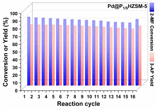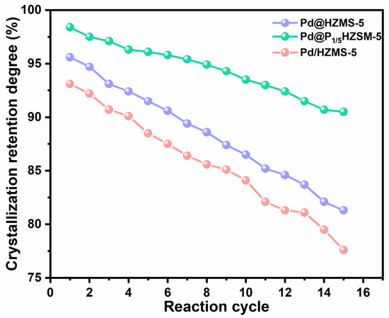 Figures S6 and S7 display the results of the cyclic performance test of Pd/HZSM-5 and Pd@HZSM-5. Pd@HZSM-5 showed better recyclability than Pd/HZSM-5 with a certain degree of loss of activity and selectivity. The cycling performance of catalyst Pd@P1/5HZSM-5 is displayed in Figure 6. Pd@P1/5HZSM-5 displayed good stability as the conversion of 2-methylfuran only went down slightly (from 88.3% to 80.9% after 15 cycles), with a decrease rate of 8.4%. However, after roasting and reducing, it increased again to 85.4%. The yield of 3-acetyl-1-propanol decreased less after the 15th cycle, from 78.7% to 73.1%, with a decrease rate of 7.1%. After roasting and reduction, the selectivity of 3-acetyl-1-propanol increased to 76.9%. This fully demonstrates the significant role of P in maintaining the stability of the catalyst. Figure 7 shows that the crystallinity of Pd@HZSM-5 decreased more quickly than that of Pd@P1/5HZSM-5; after 15 cycles, the crystallinity of Pd@P1/5HZSM-5 stayed above 90%, while it was only 80% for Pd@HZSM-5. This showed that adding P could effectively keep the catalyst’s structure intact.