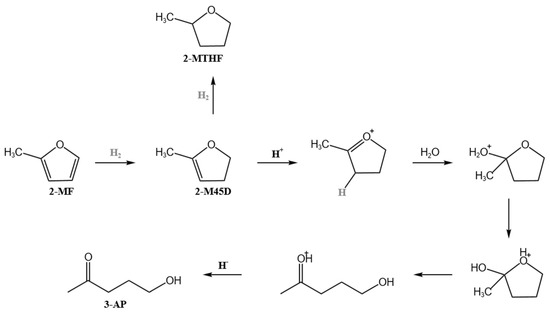 Biomass has attracted worldwide interest as an alternative to fossil fuel-derived energy sources, particularly for liquid fuel production [1]. As well as the production of bioenergy and biofuels, biomass has been employed for the production of specific biomass-derived chemicals, which are called biomass-derived platform chemicals [2,3,4,5,6,7,8]. Biomass-derived platform chemicals, due to their highly functionalized structures, have great potential in catalytic conversion and are considered one of the most effective alternatives for fossil fuel-based energy. Among them, furan and its derivatives, as key platform chemicals derived from hemicellulose and cellulose, have broad application potential [8]. 3-acetyl-1-propanol (referred to as 3-AP) plays a crucial role in the synthesis of drugs, pesticides, and fungicides. It is mainly used to prepare antimalarial drugs, such as chloroquine hydrochloride and chloroquine phosphate, and it can also be used to produce other pharmaceutical products, such as vitamin B1. Industrially, 3-AP can be synthesized via bifunctional catalytic ring-opening and hydrogenation of furfural or 2-methylfuran. Pirmorad et al. [9] employed a Pd-TiO2/CACM catalyst for the continuous production of 3-acetyl-1-propanol from furfural, achieving a conversion rate of 76% and a yield of approximately 39%. Liu et al. [10] used a Ru/C catalyst to convert furfural into 3-acetyl-1-propanol, with a conversion rate for furfural of 67% and a yield of 3-AP of 10%. However, due to the inherent instability of furfural, the ideal yield can only be achieved under low substrate concentration conditions, which restricts its application in the industrial field. As early as the 1930s, some companies began the industrial production of the conversion of 2-methylfuran to 3-AP [11,12]. The reaction proceeds as follows (Scheme 1) [13,14,15,16,17]: first, 2-methylfuran (2-MF) undergoes a hydrogenation reaction, and its chemical structure changes to the form 2-methyl-4,5-dihydrofuran (referred to as 2M45D). This step is a hydrogenation process in which the furan ring section of 2-MF is reduced by hydrogen to form the saturated 2M45D, and Pd/C is often chosen industrially as a hydrogenation catalyst. Then, under acidic conditions, the 2M45D generated in the previous step further undergoes a hydrolysis reaction and is converted into 3-AP. The hydrolysis reaction typically requires HCl, but the acidic conditions lead to Pd/C catalyst deactivation due to metal leaching under hydrothermal conditions.