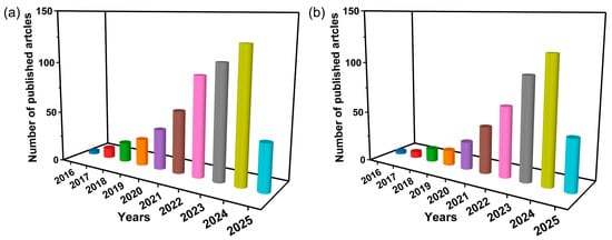 The number of published papers with photo-Fenton and heterojunction topics from 2016 to 2025 obtained from (a) Web of Science and (b) Scopus.