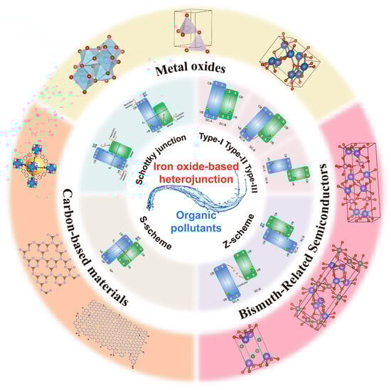 In conclusion, this work summarizes the recent advances in iron oxide-based heterojunctions for the elimination of organic pollutants in photo-Fenton systems. Firstly, the review describes the various types of heterojunctions that have been developed for the study and the application of photo-Fenton reactions, such as Schottky junctions and type-I, type-II, type-III, Z-scheme, and S-scheme junctions. In addition, the heterojunctions are classified according to the properties, energy band structures, and transfer mechanisms of carrier, while the photogenerated electron separation and transfer mechanisms are discussed in detail. Next, a series of iron oxide-based heterojunction photo-Fenton catalysts are divided into three sections: metal oxides, bismuth-related semiconductors, and carbon-based materials. Having a suitable band gap to form heterojunctions with iron oxides is important for the successful preparation of heterojunctions. Therefore, the iron oxide-based heterojunction photo-Fenton catalysts have the following features: a compact heterojunction contact interface; excellent light-absorption capacity; a wide light-absorption range; abundant active sites; high photogenerated electron-hole separation efficiency, and excellent H2O2 activation ability. The above properties enable the iron oxide-based heterojunction catalysts to rapidly degrade organic pollutants in water under photo-Fenton conditions. However, there are still several pressing challenges: secondary contamination due to iron leaching, the difficulty of designing materials with broad spectral response, and the competing effects of natural organic matter (NOM) in practical water bodies. Consequently, for the removal of organic pollutants from water by iron oxide-based heterojunctions, atomic-level interfacial modulation (i.e., single-atom catalysis, defect engineering), machine learning-assisted material screening and reaction condition optimization, and optical–electrical–magnetic multi-field coupled reactor development are important research directions.