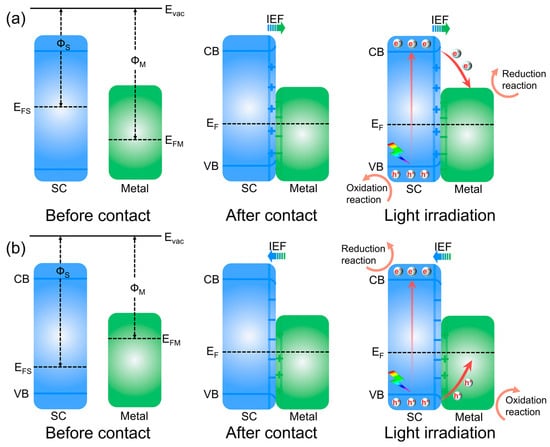 The Schottky junction consists of a semiconductor and a metal and can accelerate the transfer of carriers from the semiconductor (SC) to the metal, effectively preventing the recombination of e−–h+ pairs [33]. The performance of a Schottky junction is determined by the Fermi energy level (EF) difference between the semiconductor and the metal. Upon contacting a semiconductor with a metal, due to the gap in EF, electrons will flow from the material with the higher EF to the lower EF, thus inducing an internal electric field (IEF) at the interface [34]. This IEF effectively separates photogenerated e−–h+ pairs and facilitates e− migration [35]. As shown in Figure 3a, when the EF of the semiconductor (EFS) is above the EF of the metal (EFM), the photogenerated electron is captured by the metal, and the Schottky barrier formed captures the photogenerated hole; when the EFS is lower than the EFM, the h+ are captured by the metal, and the Schottky barrier formed prevents the transfer of the photogenerated electron to the metal (Figure 3b); and when the EF is equal between the semiconductor and the metal, the Schottky barrier is not formed.