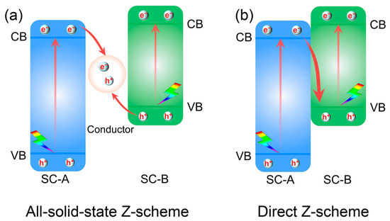 Z-scheme heterojunctions include all-solid-state Z-scheme and direct Z-scheme heterojunctions [44]. Z-scheme heterojunctions achieve efficient photogenerated carrier separation and migration by simulating natural photosynthesis with superior redox capabilities [45]. The all-solid-state Z-scheme heterojunction consists of two differential semiconductors using carbon-based materials or noble-metal nanoparticles as the electron mediators (Figure 5a) [46,47]. The heterojunction overcomes the limitation that the conventional Z-scheme is only built in the solution phase, effectively shortening the electron transfer distance and improving the photocatalytic performance. The all-solid-state Z-scheme uses an electron mediator to achieve the recombination of e− in CB of SC-A and h+ in VB of SC-B. The strongly reducing e− and strongly oxidizing h+ remaining in the CB of SC-B and the VB of SC-A contribute to reduction and oxidation reactions, respectively [48]. The direct Z-scheme heterojunction has not initially been explored in depth for its electron transfer mechanism since it was first reported by Grätzel in 2001 [49,50]. Yu et al. proposed the concept of a direct Z-type heterojunction in 2013, which effectively reduces the recombination of the e−–h+ pairs, thus enhancing the photocatalytic activity (Figure 5b) [51,52].