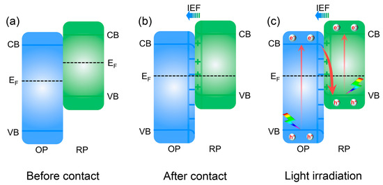 The S-scheme heterojunction was proposed based on the direct Z-scheme heterojunction [53]. As shown in Figure 6, the S-scheme heterojunction consists of an oxide photocatalyst (OP) and a reduced photocatalyst (RP) [54]. Meanwhile, the RP has a higher EF, CB, and VB than the OP. When the RP and OP are in contact, e− are transmitted from the RP to the OP owing to the different EF. In the interface, the EF of the RP is bent upward at the edge of the energy bands because of e− depletion, whereas that of OP curves downward due to the accumulation of electrons. As a result, the EF of the RP and OP equalizes at the contact point. Simultaneously, an IEF is established at the interface from the RP to OP. The IEF, band bending, and Coulomb force cooperatively attract photogenerated e− from the CB of the OP to the VB of the RP under light irradiation. Ultimately, the photogenerated e− in the CB of the RP and h+ in the VB of the OP are preserved, manifesting robust reducing and oxidizing capabilities, respectively. As a result, the S-scheme heterojunction reinforces the charge carries separation and retains the largest redox potential [55]. In addition, the S-scheme heterojunction not only provides excellent redox capacity, but also inhibits charge recombination.