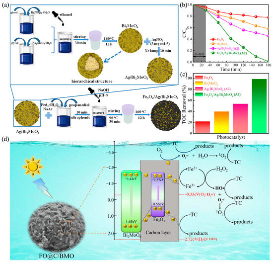 Bi2MoO6 is a direct bandgap semiconductor with a narrow bandgap ranging from 2.6 to 2.8 eV, enabling its response to visible light [102]. Meanwhile, Bi2MoO6 has excellent optical properties. In addition, the alternating arrangement of layers improves the efficiency of photogenerated carrier separation. In recent years, there have been more and more reports on the degradation of organic pollutants by Bi2MoO6 as photocatalysts [103,104,105]. Xiu et al. prepared 3D hierarchically structured Fe3O4/Ag/Bi2MoO6 magnetic microspheres with good light transmittance and absorption by the hydrothermal-photoreduction strategy (Figure 10a–c) [106]. In addition, the introduction of Fe3O4 and Ag extended the light absorption spectrum of the materials into the visible and near-infrared regions and improved the solar energy utilization. Meanwhile, the introduction of Fe3O4 realized the cooperation of photocatalysis and the Fenton reaction, which significantly improved the removal efficiency through reacting H2O2 generated from the photocatalytic reaction with Fe3O4 to generate HO•. The removal efficiencies of Fe3O4/Ag/Bi2MoO6 (A2) for Aatrex and bisphenol A (BPA) reached 98.9% and 99.2%, respectively, in 150 min. Moreover, the mineralization rate for highly toxic organic pollutants was significantly higher than that of Bi2MoO6 alone. MOF-derived spherical shell-structured Fe2O3@C-Bi2MoO6 heterojunction catalyst (FO@C/BMO) achieved the efficient photo-Fenton elimination of TC (Figure 10d) [107]. The experimental results showed that the catalyst achieved a 93.2% removal efficiency of TC within 50 min. Owing to the synergistic interaction between the Fenton process and photocatalysis, the photo-Fenton reaction exhibited a significantly higher rate constant for TC removal compared to either the Fenton reaction or photocatalysis alone. The photogenerated electrons promoted Fe3+/Fe2+ cycling, which improved the reaction performance of the catalyst. In addition, the large generation of active species such as HO•, O2•−, h+, and 1O2, which acted cooperatively in the TC removal, was confirmed in the FO@C/BMO-60 photo-Fenton system through radical scavenging tests and electron paramagnetic resonance (EPR) spectroscopy. Moreover, Table 3 summarizes the research results on the removal of the iron oxide-based heterojunction with bismuth-related semiconductors for the photo-Fenton removal of organic pollutants.