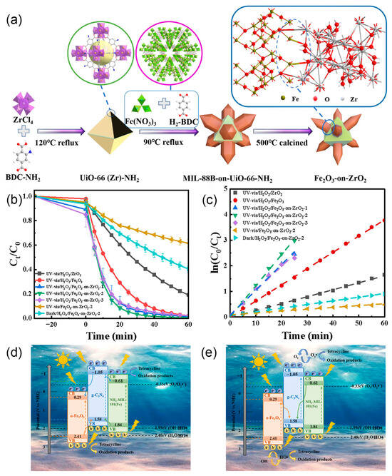 Metal–organic frameworks (MOFs), made up of metal nodes linked by organic ligands, are promising in catalysis due to their excellent catalytic activity, tunable crystal structure, and high porosity [118]. The adaptable nature of metal centers and organic ligands in MOFs contributes to enhanced photocatalytic efficiency and makes them suitable candidates for heterojunction construction [119,120]. Fe2O3-on-ZrO2 polypod catalysts were prepared by an MOFs derivatization strategy by compositing UiO-66(Zr)-NH2 and MIL-88B(Fe) via solvothermal reaction and high temperature calcination (Figure 11a–c) [121]. The catalysts were prepared by a strategy involving MOFs derivatization coupled with reflux thermal treatment and the calcination method for the degradation of TC-HCl in wastewater. The Fe2O3-on-ZrO2 achieved a removal efficiency of more than 95% for 20 mg L−1 of TC-HCl in 25 min, and the removal efficiency could still reach 91% after five cycles, which showed excellent stability and reusability. In addition, Fe2O3-on-ZrO2 had abundant Fe2O3-on-ZrO2 heterojunctions, which promoted the transfer of photogenerated electrons from ZrO2 to Fe2O3 and accelerated the cycle of iron. The low photogenerated carrier recombination efficiency and high photogenerated carrier separation efficiency of Fe2O3-on-ZrO2 were confirmed by PL and photocurrent response tests. Meanwhile, the important roles of HO• and O2•− in the degradation mechanism were confirmed by free radical trapping experiments and ESR techniques. In addition, the scanning Kelvin probe (SKP) technique was used to measure the surface work function of the samples, which further revealed the photogenerated carrier transfer mechanism. In addition, a novel heterogeneous photo-Fenton catalyst, α-Fe2O3@g-C3N4@NH2-MIL-101(Fe) (FGN), incorporating a dual Z-scheme heterojunction structure, was synthesized by Hu et al. via hydrothermal approach for the removal of TC (Figure 11d,e) [122]. The FGN removed 98.33% of 10 mg L−1 TC in 12 min, and the removal efficiency was maintained at 92.27% after five cycles. In addition, the H2O2 consumption test and free radical quenching experiment confirmed that O2•− served as the principal active component within the system. Meanwhile, the semiconductor type and flat band potentials were determined by the Mott–Schottky test, and the transfer path of photogenerated carriers in FGNs, i.e., the dual Z-scheme heterostructure mechanism, was proposed.