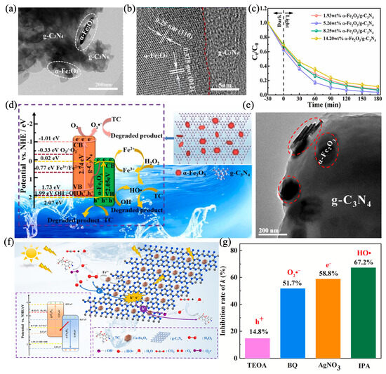 (a) TEM; (b) HRTEM of 5.26 wt% α-Fe2O3/g-C3N4 heterojunction; (c) effect of α-Fe2O3 mass ratio on degradation efficiency; (d) possible mechanism of TC degradation over α-Fe2O3/g-C3N4 heterojunction [131]; (e) TEM image of the α-Fe2O3/g-C3N4 3 composite; (f) proposed mechanism of TC degradation on α-Fe2O3/g-C3N4 3 photocatalysts [132]; (g) inhibition rate of k by different quenching agent [145].