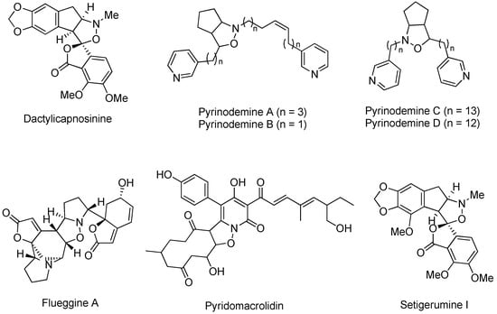Isoxazolidines are a class of heterocyclic skeletons containing both nitrogen and oxygen atoms and often exist in a number of biologically active natural products and drug molecules [10,11] (Figure 1). Dactylicapnosinine has analgesic, antiemetic, and antihypertensive properties, and pyrinodemine has antiseptic and disinfectant properties. Flueggine A is a potential hypolipidemic drug. In addition, a number of molecules containing the isoxazolidine backbone have attracted much attention as nucleoside analogues [12]. In organic chemistry, isoxazolines are a very important class of intermediates with a wide range of uses because the nitrogen–oxygen bond in isoxazolines is easily broken. Accordingly, researchers can synthesize compounds such as β-lactams, β-amino acids, and 3-amino alcohols via reductive cleavage of the nitrogen–oxygen bond of isoxazolines thereby [13,14,15]. On this basis, some researchers have focused on the development of novel, green, and efficient synthetic methods for isoxazolidines. The current methods for the synthesis of isoxazolidines include the cycloaddition of hydroxylamine with olefins, the cycloaddition of oxaziridines with olefins or aromatics, the cycloaddition of cyclopropanes with nitroimines, and the cycloaddition of 2-nitropyridines with allylstannane, among others [16,17,18,19,20]. Although these methods are more helpful in the synthesis of isoxazolidines, the most commonly used method nowadays is the [3 + 2] cycloaddition reaction of nitrones with olefins.