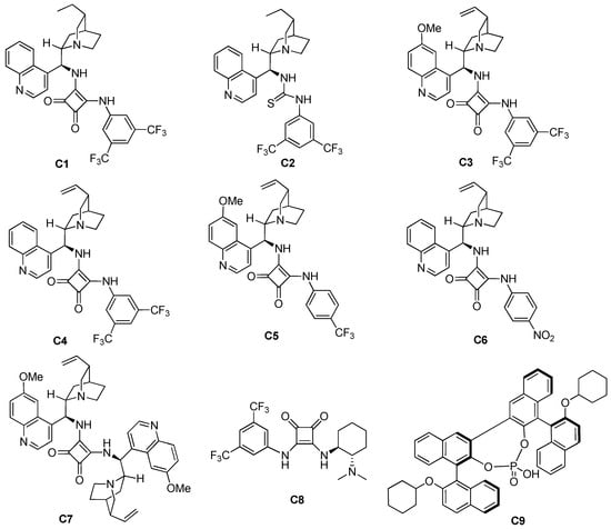 The structure of the catalyst plays a crucial role in the asymmetric catalytic reaction, so a series of different organocatalysts were screened first, and the selected organocatalysts are shown in Figure 2. The catalytic effects of squaramide and thiourea catalysts with the same substituent group are first compared, and it was found that thiourea catalyst C2 (79% yield, >20:1 dr, and 56% ee) was not as effective as squaramide C1 (86% yield, >20:1 dr, 64% ee) with the same substituent group. Therefore, we screened a series of squaramide catalysts. Among these catalysts, C3, C4, and C6 showed good stereoselectivity, all of which afforded the product with 67% ee, but the yield using C6 was lower than that of using other two catalysts, which was 80%. The yield using catalyst C7 was high (89%), but its enantioselectivity was the worst among the selected catalysts (53% ee). When phosphoric acid C9 was used, no formation of the target product was observed. Ultimately, C4 (Table 1, entry 4) was selected as the best catalyst to ensure both good yield and good stereoselectivity (87% yield, >20:1 dr, 67% ee). The catalytic effects of different catalysts are shown in Table 1, entries 1–9.