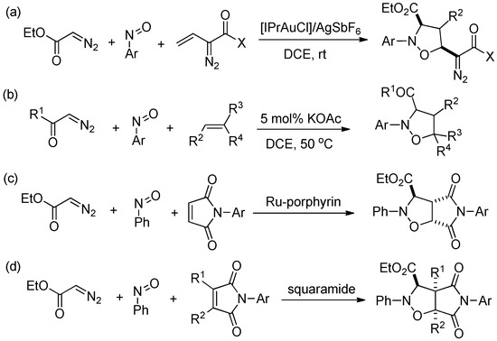 - Pagar, V.V.; Liu, R.S. Gold-catalyzed cycloaddition reactions of ethyl diazoacetate, nitrosoarenes, and vinyldiazo carbonyl compounds: Synthesis of isoxazolidine and benzo[b]azepine derivatives. Angew. Chem. Int. Ed. 2015, 54, 4923–4926. [Google Scholar] [CrossRef]