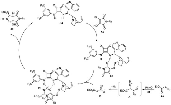 Owing to 4 products being oily liquids, we cannot obtain the single 4 products crystal for x-ray diffraction analysis. We also tried to obtain the single crystal of 4 products with other compounds using the co-crystallization method, but all attempts failed. Based on the above experimental results and the corresponding literature [25], a plausible mechanism is proposed in Scheme 3. First, in the presence of 5 mol% C4, the starting material 2a reacts with nitrosylbenzene 3a to produce intermediate A, which is followed by dinitrogen to form nitrone B. This in situ-generated nitrone then undergoes a 1,3-dipolar cycloaddition reaction with 1a to produce the final product isoxazolidine 4a. Thus, catalyst C4 may first activate the reaction of the diazonium ester with the nitrosylbenzene and promote the subsequent cleavage of the diazonium moiety to produce the nitrone intermediate. At the same time, the squaramide hydrogens in catalyst C4 are bonded with the carbonyl group of 1a, and the tertiary amine N atom activates the hydroxyl group in 1a via hydrogen bonding. The squaramide hydrogen in catalyst C4 also bonds with the nitrone group and synergistically promotes a dipolar cycloaddition reaction that leads to the formation of the cycloadduct 4a. The trans-configuration of substituents was tentatively assigned according to the plausible mechanism.