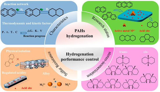 In summary, the primary challenges in the hydrogenation of PAHs include the following: (i) increased reaction difficulty due to changes in resonance energy; (ii) adsorption challenges arising from steric hindrance, which affects the activation of reactants on the catalyst; and (iii) inhibition of terminal ring hydrogenation caused by competitive adsorption among the products. These factors combine to make the hydrogenation of PAHs a complex and challenging process [33,40,41].