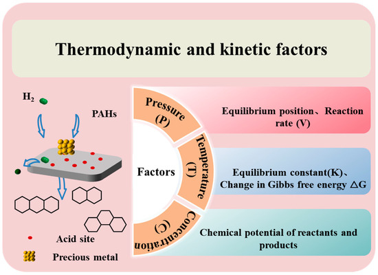 The hydrogenation saturation of PAHs is a reversible, strongly exothermic, and volume-reducing process. Higher hydrogen partial pressures and lower reaction temperatures favor the forward reaction. Cooper [8] studied the equilibrium concentrations of phenanthrene and naphthalene hydrogenation in relation to temperature and pressure. They found that the equilibrium concentration of aromatics increased with temperature, while at lower temperatures, the hydrogenation equilibrium concentration of the last ring was lower than that of the first ring. Additionally, increasing hydrogen pressure significantly reduces the equilibrium concentration of aromatics. Hou [25] further characterized the hydrogenation equilibrium constants of anthracene across various temperature ranges, revealing an inverse relationship between equilibrium constants and temperature. At the same time, temperature also affects product selectivity to a certain extent. Ma et al. [26] found that Ni catalyze naphthalene hydrogenation at 473–553 K is more conducive to the formation of cis-decalin.